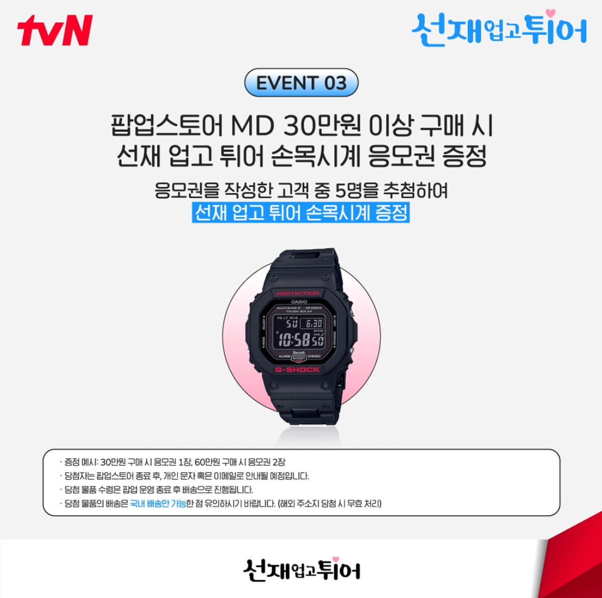 팝업스토어 MD 30만원 이상 구매시 선재 업고 튀어에서 타임슬립을 가능하게 한 손목시계 응모권을 증정하여 5명을 추첨한다고 하는데요. 30만원 이상 무조건 1장이 아니라 60만원 이상이면 2장을 준다고 합니다.