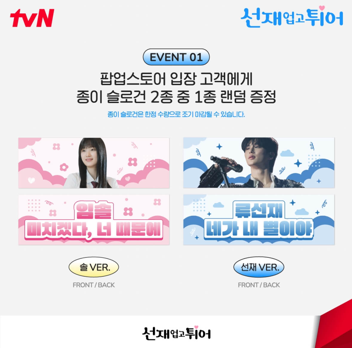 방문 고객 이벤트로 입장 고객 전원 종이 슬로건을 랜덤 증정한다고 하나 한정수량으로 조기 마감이 될 수 있으니 빨리 방문하시는 게 좋을 것 같습니다. 솔이 버전과 선재 버전으로 2가지가 있습니다.