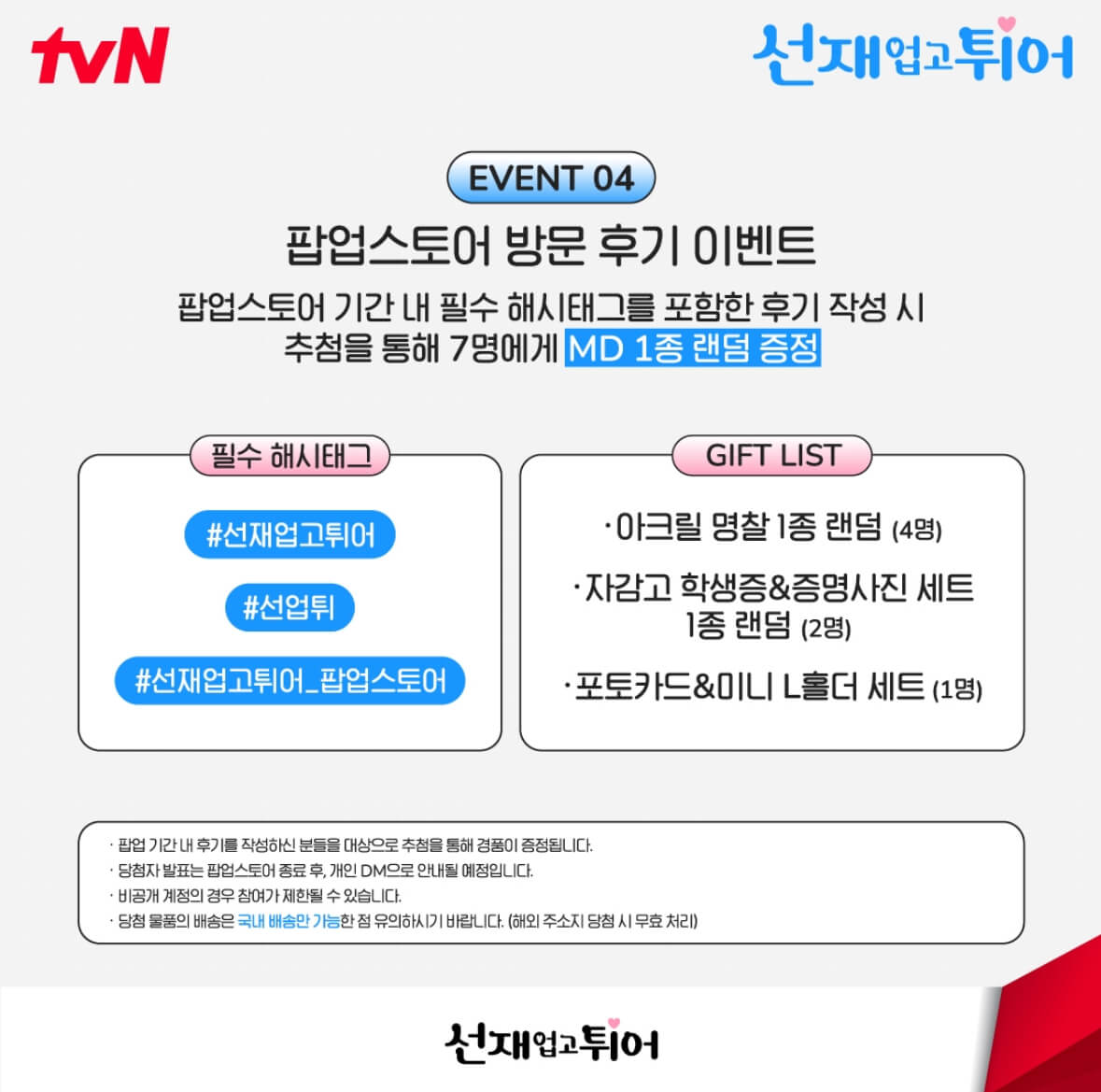 팝업스토어 기간인 23일부터 29일동안 필수 해시태그를 포함하여 후기를 작성한 팬분들에게 추첨을 통해 MD 1종을 랜덤 증정 한다고 하니 방문 후기 이벤트도 노려보시면 좋겠습니다. 당첨자는 팝업스토어 기간 종료 후 DM으로 연락을 한다고 하며 비공계 계정일경우 제한될 수 있으니 이점 유의해 주시기 바라겠습니다.