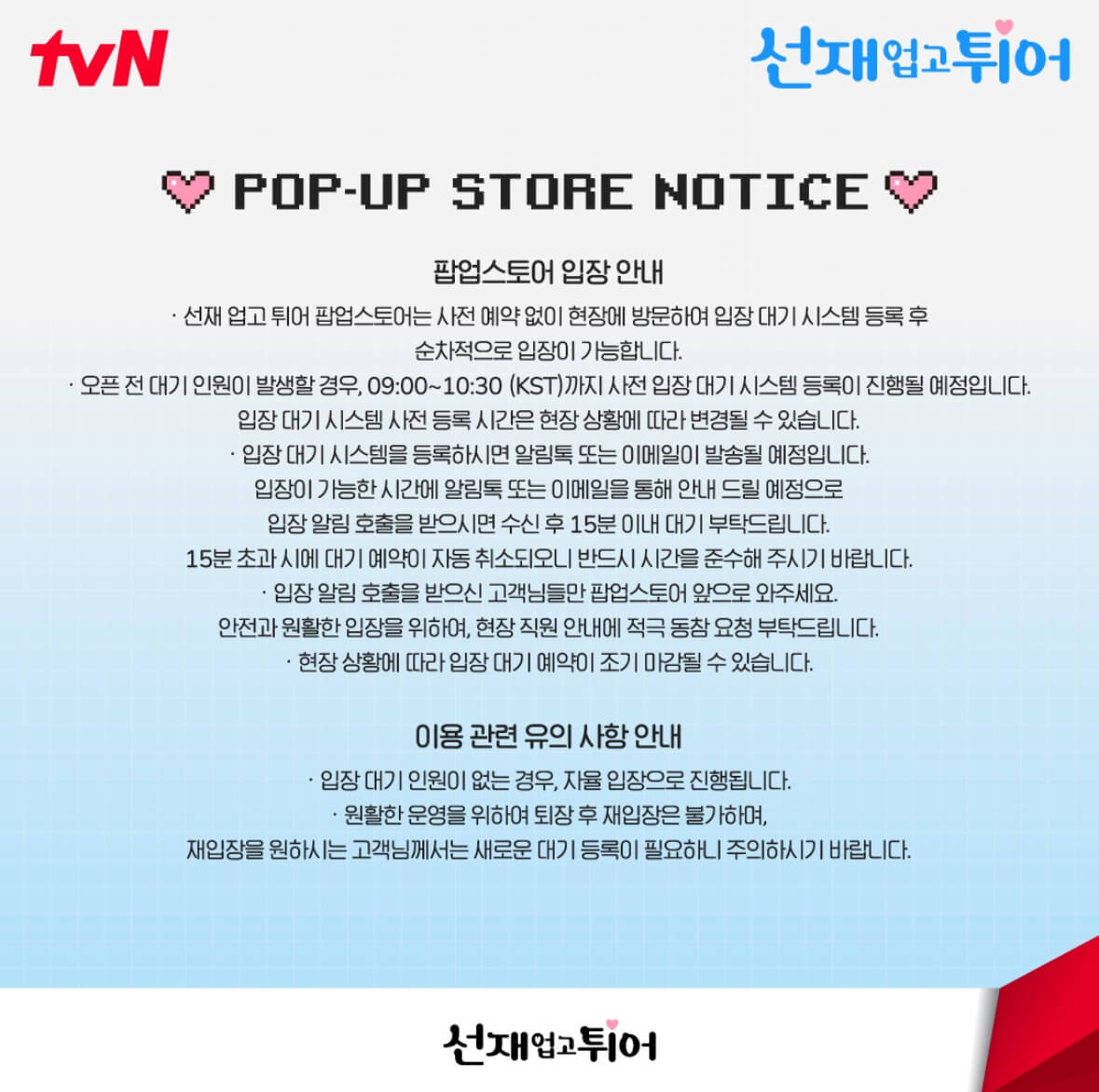 이번 선재 업고 튀어 팝업스토어는 사전 예약 없이 현장방문으로 이루어지나 오픈 전 대기 인원이 발생할 경우 사전 입장 대기 시스템 등록을 진행할 예정이라고 합니다. 입장 대기 시스템 등록 후 알림톡 또는 이메일로 안내를 드리며 호출받으신 후 15분 이내 대기를 하면 된다고 합니다.