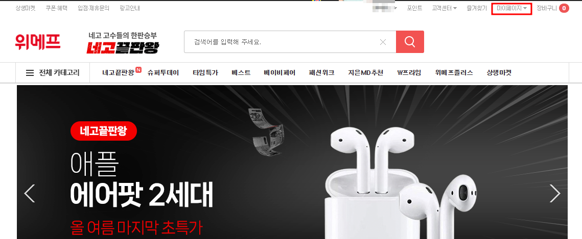 ① 위메프 로그인 후 오른쪽 상단 마이페이지를 눌러줍니다.