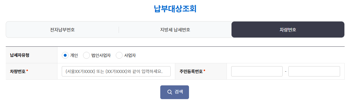 납부대상조회 - 차량번호를 누른 후 차량번호와 주민등록번호를 입력하여 검색을 눌러줍니다.