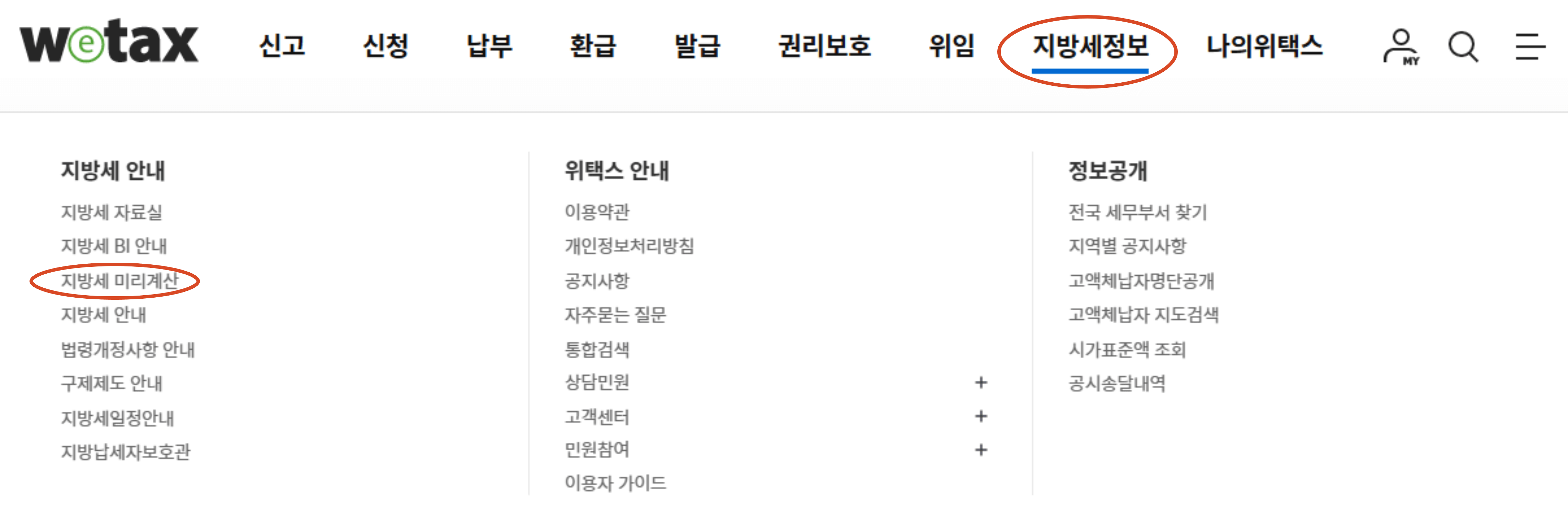 위택스 - 지방세정보 - 지방세 미리계산하기 클릭