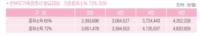 한부모가족증명서 발급 : 기준중위소득 72% 이하, 아빠 또는 엄마의 나이가 24세 이하인 청소년한부모 가구