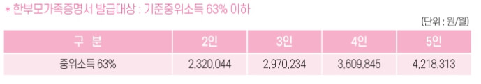 한부모가족증명서 발급 : 기준중위소득 63% 이하, 18세 미만의 자녀를 야육하는 한부모가족 및 조손가족